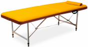 Данный стол обладает великолепным внешним видом и красивой отделкой. Его вес составляет всего 12 кг., при этом он выдерживает серьезные динамические нагрузки. Двухсекционная модель удобна для установки, складываясь пополам и пряча ножки стол внутри себя. Все элементы закрепляются специальными ремешками и прочными защелками. В сложенном виде косметологический стол напоминает чемоданчик. Для удобства транспортировки предусмотрена специальная ручка. Важно также его зафиксировать, чтобы он был неподвижен во время работы. Устойчивость можно проверить опытным путем: сесть и попытаться немного расшатать. Если он остался неподвижен, то это идеальный вариант, впрочем, если ходит лишь слегка, то это тоже допустимо.