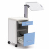 Тумбочка прикроватная на колёсах BLZ 016 с дополнительным выдвижным столиком и скруглённым белым фасадом. Передвижная прикроватная тумбочка на самоориентирующихся двойных роликах, два из которых которых оснащены тормозным устройством. Cнабжена отделением с дверцей и полкой внутри, глубоким выдвижным ящиком и дополнительным выдвижным столиком, убирающимся под топ. Столешница с четырехсторонней выпрессованной отбортовкой. Широкая металлическая ручка сбоку позволяет легко перемещать тумбочку или удобно подвешивать за неё различные аксессуары.